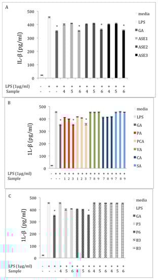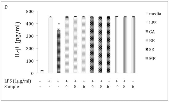 Effect of extracts and phenolics on IL-β expression in macrophage RAW 264.7 cells (A) extracts obtained by ASE; (B) pure phenolic acid standards; (C) crude polysaccharide extracts; and (D) different extraction methods. Cells were cultured in the absence or presence of LPS (1 μg /mL) with various concentrations of different samples for 24 h (0 = media; GA = 2 μM; 1 = 5 μM; 2 = 10 μM; 3 = 20 μM; 4 = 50 μg/mL; 5 = 100 μg/mL; and 6 = 150 μg/mL; 7 = 25 μM; 8 = 50 μM; and 9 = 100 μM). IL-β production was determined through an ELISA. The data represent the mean ± SD of triplicate experiments. Statistical significance p < 0.05 (*) was determined using one-way analysis of variance for independent means, followed by Tukey’s HSD test.