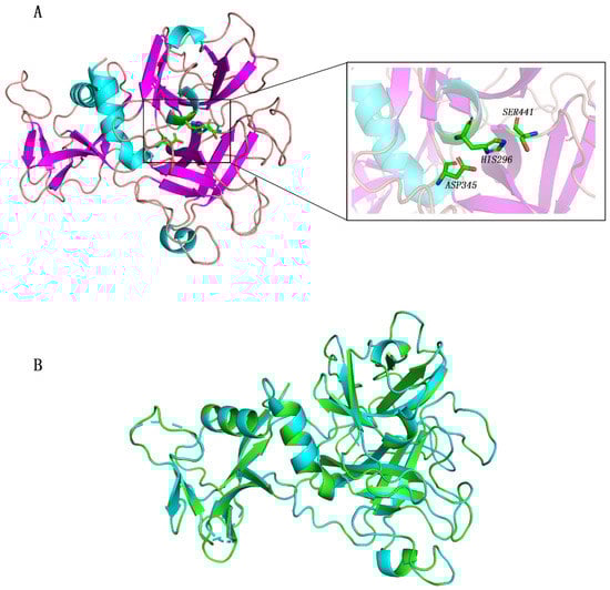 Structure of TMPRSS2 (PDB ID 7MEQ). Active site residues His296, Asp345, and Ser441 are presented as green sticks (A). Alignment diagram between 7MEQ and reconstructed TMPRSS2; RMSD is 0.049 Å (B). TMPRSS2 is presented in green; 7MEQ is presented in blue.