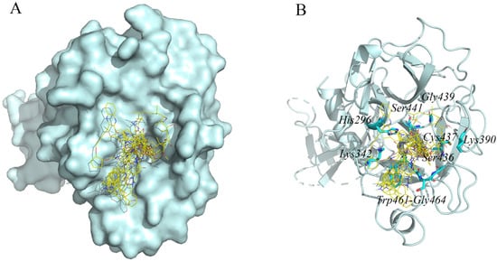 Diagram of the top 10 compounds binding to the protein TMPRSS2. (A) The top 10 compounds are presented as yellow lines; TMPRSS2 is presented in cyan. (B) The top 10 compounds are presented as yellow lines; TMPRSS2 is presented as a cyan cartoon; and amino acid residues of TMPRSS2 bound to the inhibitor are presented as cyan sticks.