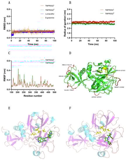 Schematic representation of RMSD (A), radius of gyration (B), and RMSF (C) of the systems during 100 ns MD simulations. (D) Flexible amino acid residues and active sites during the 100 ns MD simulation. TMPRSS2E/L represents the protein structure of the complex of TMPRSS2 with ergotamine or lumacaftor. Structures in red are amino acid residues with increased freedom, while bars in yellow represent active sites of TMPRSS2. Binding region of ergotamine (E) or lumacaftor (F) with TMPRSS2.
