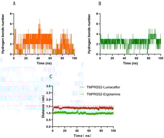 Number of hydrogen bonds between (A) lumacaftor or (B) ergotamine and TMPRSS2. Center-of-mass distance (C) between Ser441 residue of TMPRSS2 and ergotamine or lumacaftor.