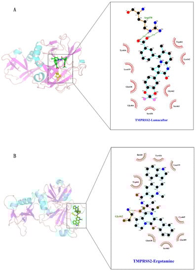 In this study, we used the crystal structure of TMPRSS2 as a virtual screening target to identify potentially effective drugs for COVID-19 treatment from the FDA database. Subsequently, we identified two potent inhibitors, namely, lumacaftor and ergotamine. We indirectly evidenced the inhibition of TMPRSS2 by lumacaftor or ergotamine through a series of molecular dynamics analyses, including protein–ligand binding stability, binding free energy, hydrogen bond number, and center-of-mass distance. It has long been proven that ergotamine has the ability to bind with the SARS-CoV-2 MPRO, PLPRO, S protein, RdRp protein, and 2′-O-MTase, and human NRP1 [26,27,28,29,30,31,32]. Lumacaftor also has the ability to bind with the S protein [33,34].