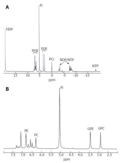 Typical proton-decoupled in vitro 31P-NMR spectrum of perchloric acid-extracted normal liver tissue. (A): Full spectrum; (B): PME and PDE regions. NDP: nucleotide diphosphates; MDP: methylene diphosphonate (chemical-shift reference compound); other abbreviations: see text. Reprinted under the Creative Commons Attribution License (CCAL) terms from [20].