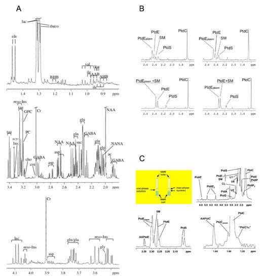 - Lutz, N.W.; Cozzone, P.J. Phospholipidomics by phosphorus nuclear magnetic resonance spectroscopy of tissue extracts. In Methodologies for Metabolomics; Lutz, N.W., Sweedler, J.V., Wevers, R.A., Eds.; Cambridge University Press: New York, NY, USA, 2013. [Google Scholar]