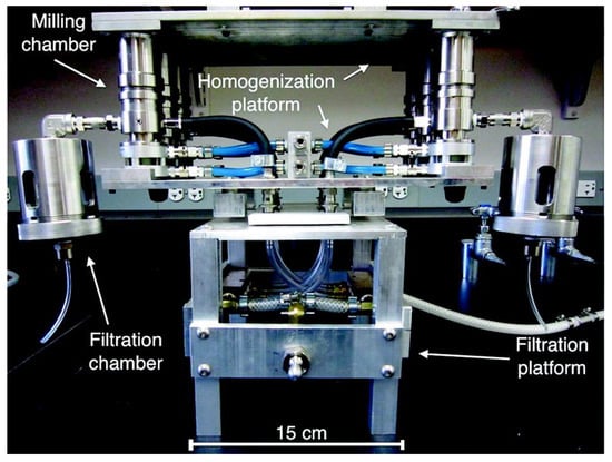 Ellinger et al. suggested a semiautomated extraction method for metabolomics [50]. This project was driven by the intention to (i) reduce manual manipulations that may be a source of error, and (ii) speed up the extraction process. The prototype of their semiautomated metabolite batch extraction device (SAMBED) enables six parallel extractions of samples ranging between 0.05 and 1.0 g tissue each, and integrates the three basic steps involved in the extraction procedure: tissue homogenization, actual metabolite extraction, and sample filtration. This system consists of six integrated components: a milling chamber, a vibrational shaker, a solvent reservoir, a homogenization platform, a filtration chamber, and a filtration platform (Figure 3). Apart from the separation of supernatant from cellular debris and precipitated compounds (filtration instead of centrifugation), also the solvents used differ substantially from established extraction protocols used in 1H-NMR metabolic analysis. For instance, the use of a mixture of acetonitrile, methanol and water as an organic extraction solvent appears to be inspired by HPLC analysis. Moreover, aqueous extraction by way of using water at 95 °C is fundamentally different from conventional protocols keeping the sample at low temperatures (4 °C), whenever possible, to suppress chemical reactions that may lead to erroneous results. Moreover, tissue samples need to be dry (lyophilized) before being processed by SAMBED, which adds freeze-drying before the extraction procedure, a step that is not needed in conventional extraction protocols. Thus, although an impressive acceleration of their particular extraction process, based on dried liver tissue, was reported when SAMBED was compared to manual execution of the same procedure, the question of how speed and quality of SAMBED extraction relate to those obtainable by classical extraction methods based on wet tissue has not been addressed. Apart from this question, overall confidence intervals measured for absolute concentrations of all metabolites were comparable between SAMBED and manual extraction procedures.