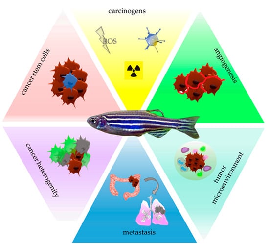 Zebrafish have high genetic homology with the human body. The sequenced genome (Danio has 25 chromosomes) and the presence of approx. 70% of human genes make this animal unique [1,2]. Major organs and tissues (brain, heart, kidneys, muscles, liver) share many features with humans, both anatomically, physiologically, and molecularly [3,4,5,6]. The easiness of reproduction and a short development cycle (approx. 3 months from egg to adult), the possibility of frequent obtaining large amounts of research material, the simplicity of genetic manipulation, and the abundance of mutants and the transgenic lines collection are undoubtedly some of the most important aspects, giving zebrafish an advantage over mouse or rat research models. Zebrafish mature within about three months after fertilization. This allows the conducting of experiments with high throughput, with the use of a small number of reagents, low financial costs, and better statistical evaluation of the obtained results (large research groups). Equally important is the fact that in the first days of life, zebrafish embryos are relatively large and transparent, which makes it possible to observe and document processes taking place in the body in real-time [7]. What is more, the Danio rerio immune system retains a lot of homology with the human system, which is an invaluable tool for researching the newly-growing field of science—immuno-oncology [8]. All this makes the zebrafish an indispensable tool to face the challenges posed by modern oncology in terms of understanding cancer pathogenesis. This article aims to present Danio rerio as a unique organism that can be used as a complementary model to those commonly used ones, and which may help to overcome an existing limitation in oncological research. The knowledge gained from research using this model organism will certainly contribute to a better understanding of cancer development and establishing new treatment strategies.