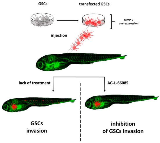 Participation glioma stem cells (GSCs) in the invasion using the zebrafish model. MMP-9-matrix metalloproteinase; AG-L-66085-MMP-9 inhibitor (based on results shown by Yang X jun et al.) [41].