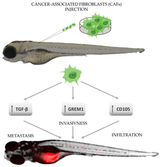 The role of cancer-associated fibroblasts (CAFs) in promoting tumor progression in zebrafish xenografts. CAFs—cancer-associated fibroblasts; CD105—endoglin, homodimeric transmembrane glycoprotein belongs to TGF-β family receptors, GREM1—gremlin 1, bone morphogenic protein antagonist; TGF-β—transforming growth factor β (based on results shown by Sun DY et al., Ren J et al., and Paauwe M et al.) [84,85,86].