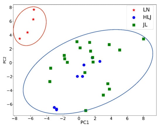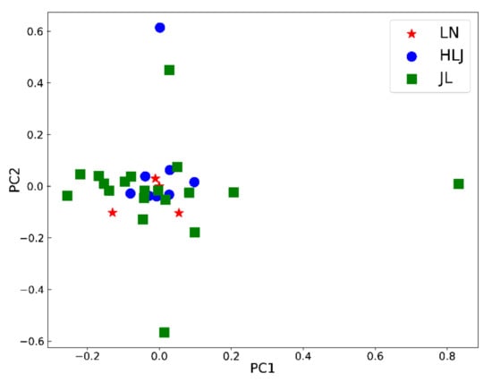 PCA, a commonly used unsupervised data processing model, was used to discover the trends of the ginseng samples from different growing origins. The first two principal components only accounted for 33.0% of the variation. As shown in Figure 2, the 31 batches of ginseng samples failed to establish origins.