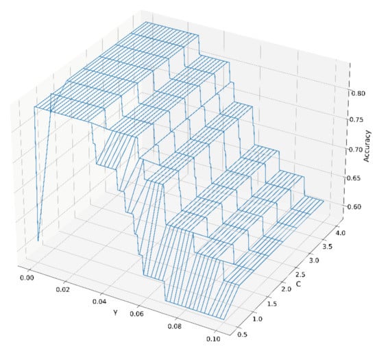 The best values for parameter C and parameter γ of the SVM model were calculated using a grid search method combined with ten-fold cross-validation. The parameter C affected the distance between the support vector and the decision plane. The parameter γ was mainly used to map the height of the low-dimensional samples. Classification accuracy under different combinations for γ and C are shown in Figure 4. There was a large plateau, indicating that the SVM model was well-establishment, and a γ value of 0.03 and a C value of 1 were chosen in the ten-fold cross-validation for all data.