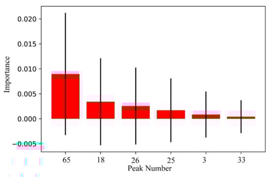 As far as we know, key feature extraction for SVM is still a challenge, which cannot be handled by traditional statistical methods, such as the t-test. To deal with this problem, a permutation importance algorithm was employed in this study. According to the formula (A9), the contribution of all peaks to the SVM was calculated. In the next step, the potential quality markers of ginsengs from JL, LN, and HLJ were selected due to the calculations. Based on the importance value (IV > 0), six quality markers were discovered, including peak 65 (AcO-ginsenoside Rd or isomer), peak 18 (AcO-ginsenoside Re or isomer), peak 26 (Ginsenoside Re2 or isomer), peak 25 (Notoginsenoside M or isomer), peak 3 (Ginsenoside Re2 or its isomer), and peak 33 (Yesanchinoside J or isomer). Their contributions were ranked from highest to lowest as shown in Figure 5. Box plots of the six quality markers are shown in Figure S6, which indicates that there were distributional differences between the same characteristics in JL, LN, and HLJ.