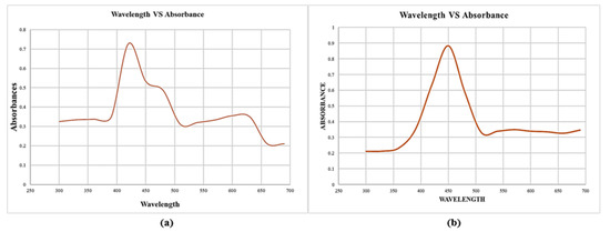 The synthesis and stability of reduced AgNPs in colloidal solution were examined using a UV visible spectrophotometer. The maximum absorbance at 450 and 420 nm was observed in the visible UV spectra, as shown in Figure 2, which corresponds to the surface plasmon resonance (SPR) of the AgNPs. Surface Plasmon Resonance (SPR) patterns are commonly used as indicative tools for metal nanoparticle formation, as SPR depends on various parameters, such as size and medium dielectric constant [31]. The Ag+ ions were reduced extracellularly, indicating the formation of silver nanoparticles.