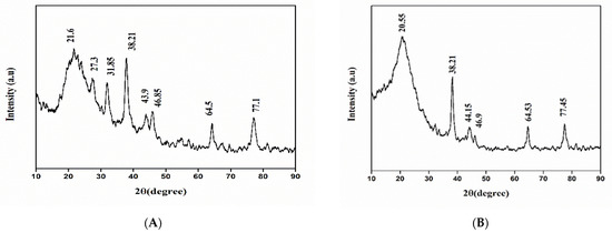 XRD pattern of silver nanoparticles synthesized using Acer oblongifolium extract. (A) Synthesized from 25 mM solution of AgNO3, (B) synthesized from 1 M solution of AgNO3.