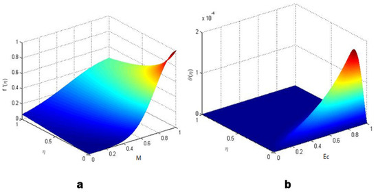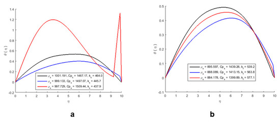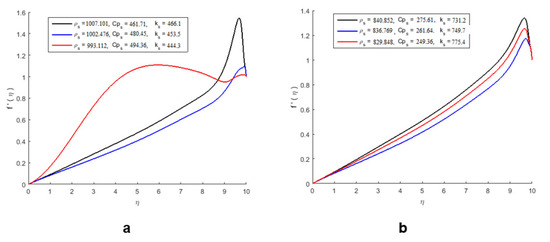 The effect of pure nanoparticles’ parameters on the velocity profile without mixing with water is shown in Figure 7a, and the effect of nanoparticles on the parameters of the velocity profile after mixing with water is shown in Figure 7b. The deplanement of the volume fraction parameters positively affected the nanofluid velocity. By improving the nanoparticles, the thickness of the boundary layer of the flow reduces, which results in an increase in the velocity of the nanofluid. However, we observed that the behavior of the velocity field is opposite in Figure 7b.