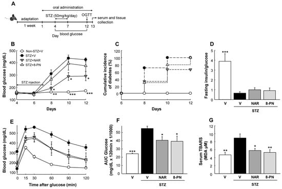 Effects of naringenin and 8-PN on glucose homeostasis. (A) Timeline of the study. On the 4th day of oral administration, diabetes was induced by intraperitoneal injection of STZ at a dose of 50 mg/kg/day for four consecutive days. (B) Random-fed blood glucose concentrations. (C) Cumulative incidence of diabetes was calculated as the percentage of hyperglycemic mice (glucose level ≥ 250 mg/dL) at each time point. (D) The ratio of fasting serum insulin (pg/mL) to blood glucose (mg/dL) was used as an index of insulin deficiency in mi€ (E) Glucose concentrations during glucose tolerance testing with (F) corresponding area under the curve (AUC) (×1/1000) were measured at Day 12. (G) Thiobarbituric acid reactive substances (TBARS) concentrations in serum were expressed in terms of malondialdehyde (MDA) equivalents. V, vehicle; NAR, naringenin; 8-PN, 8-prenylnaringenin. Data are shown as means ± SEM (n = 6). * p < 0.05, ** p < 0.01, *** p < 0.001 vs. STZ-vehicle group.