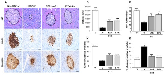 Protective effects of naringenin and 8-PN against islet dysfunction. (A) H&E and DAB staining for insulin and glucagon were performed to analyze histopathological changes in pancreatic islets (×400) at the end of study. H&E-stained sections were analyzed for the measurement of (B) islet area and (C) islet number using ImageJ software. Quantitative data of (D) insulin and (E) glucagon signals were calculated by dividing the area of target signal by the total islet area, for at least 10 islets per mouse. V, vehicle; NAR, naringenin; 8-PN, 8-prenylnaringenin. Data are shown as means ± SEM (n = 4). ** p < 0.01, *** p < 0.001 vs. STZ vehicle group.