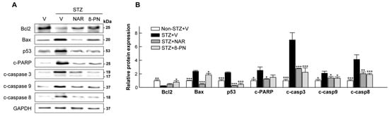 Inhibitory effects of naringenin and 8-PN on apoptotic signaling in the pancreas. (A) Representative Western blot images of pancreatic Bcl2, Bax, p53, cleaved PARP, cleaved caspase-3, cleaved caspase-9, and cleaved caspase-8 and (B) corresponding quantitative data were used for evaluating β-cell apoptosis. V, vehicle; NAR, naringenin; 8-PN, 8-prenylnaringenin. Data are shown as means ± SEM (n = 6). * p < 0.05, ** p < 0.01, *** p < 0.001 vs. STZ-vehicle group.