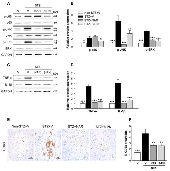 To investigate the possible upstream signaling involved in the suppression of β-cell apoptosis by naringenin and 8-PN, we monitored the changes of inflammatory responses in the pancreas next. Along with markedly increased expression levels of TNF-α and IL-1β proteins, the phosphorylation levels of p65, JNK, and ERK as key mediators of cytokine-induced β-cell apoptosis [21] were enhanced in STZ-vehicle mice (Figure 4A–D). However, these STZ-induced changes were effectively inhibited by naringenin and 8-PN except for the expression of phosphorylated p65 in the STZ + naringenin group. Moreover, histological examination showed marked peri- and intra-islet infiltration of CD68+ macrophages in the STZ-vehicle group, which was significantly reduced by naringenin and 8-PN treatments (Figure 4E,F). These findings suggest that both naringenin and 8-PN could counteract STZ-induced β-cell apoptosis by inhibiting macrophage infiltration into the pancreas and subsequent cytokine-induced NF-κB and MAPK activations.