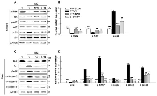 In addition to the pancreas, the skeletal muscle and liver are also considered as target tissues in which STZ can directly or indirectly show its cytotoxic effects [22,23]. The PI3K/Akt pathway has been identified as one of the most important pathways for insulin-stimulated glucose uptake in skeletal muscles [24]. Moreover, NF-κB activation is thought to play a key role in glucose metabolism abnormalities and muscle wasting [25]. In this study, STZ treatment markedly reduced the expression levels of phosphorylated PI3K and AKT, whereas it increased p65 phosphorylation in skeletal muscles (Figure 5A,B), indicating insulin-signaling defects by STZ. Importantly, naringenin and 8-PN significantly reversed the expression levels of these muscle proteins induced by STZ. In addition, consistent with their inhibitory effects on pancreatic apoptosis, their treatments normalized apoptotic protein expressions in the liver, which were significantly increased by STZ (Figure 5C,D).