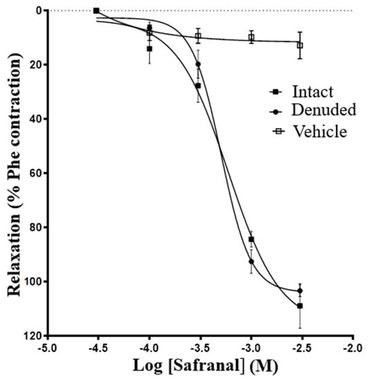 3.1. Effect of Safranal on Rat Aorta Rings Precontracted with Phenylephrine
