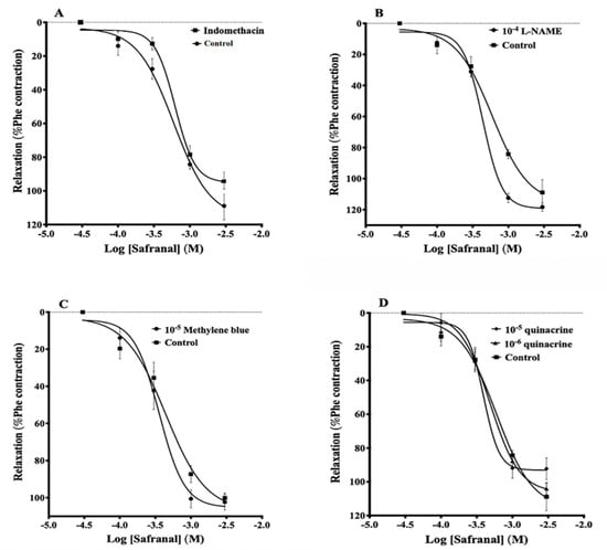Safranal-induced vasorelaxation in the presence of indomethacin (A), L-NAME (B), methylene blue (C), and quinacrine (D). Aortic vessels were precontracted with 5 × 10−5 M Phe, then challenged with safranal in the absence or the presence of the inhibitors. Values are expressed as means ± SEM. n = 9 for (A,B); n = 7 for (C,D).