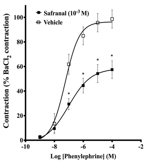 Effect of 10−3 M safranal on the concentration–response curves of Phe (10−9–10−4 M) in aortic rings. Contractile responses are expressed as the percentage of maximum contraction evoked by BaCl2 (3 × 10−3 M). Data are the means ± SEM of 6 experiments. * indicates significant difference at p < 0.05 compared to the vehicle.