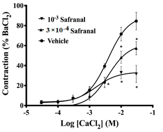Concentration–response curves of CaCl2 (3 × 10−5–3 × 10−2 M) in the presence of 3 × 10−4 M safranal (triangles, n = 11) and 10−3 M safranal (inverted triangles, n = 11) or the vehicle (circles, n = 9). Contractile responses are expressed as a percentage of maximum contraction evoked by BaCl2 (3 × 10−3 M). Values are means ± SEM. * indicates that p < 0.05 compared to the vehicle.