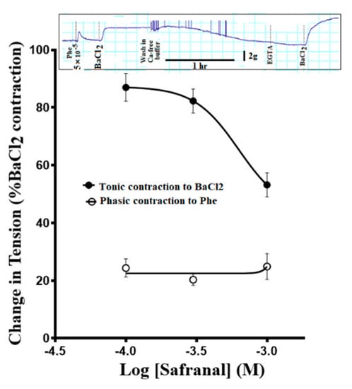 3.4. Effect of Safranal on Ca2+-Induced Contraction in Calcium-Free Depolarizing Solution