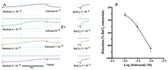 Figure 6A shows a sample experiment in which incubation of aortic rings with 4 × 10−4 M ouabain caused a slow development of tension that was equal to 76.95 ± 1.74% of BaCl2 maximum contraction in 133.0 ± 8.0 min. Safranal relaxed these contractions in a concentration-dependent manner (Figure 6B). When safranal and ouabain were washed, the aortic rings developed normal potent contractions (Figure 6A).