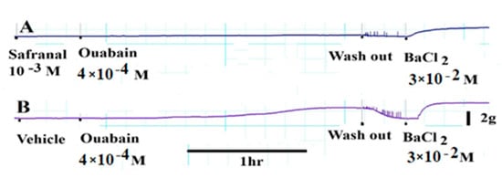 Incubation of aortic rings with 10−3 M safranal (A) totally blocked the development of tension due to 4 × 10−4 M ouabain. Incubation of aortic rings with 4 × 10−4 M ouabain causes the development of sustained contractions in the presence of safranal solvent (B). n = 6.