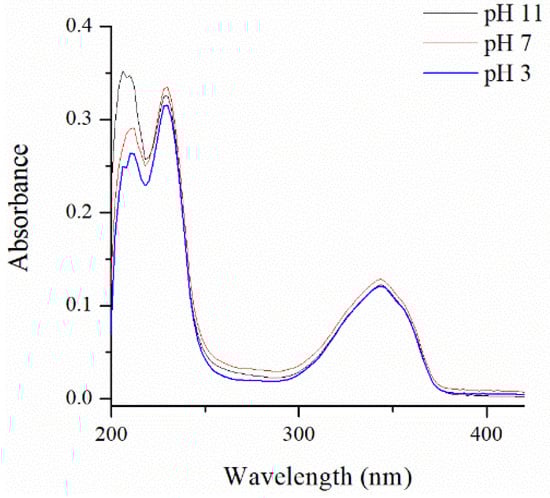 The synthesized probe 4 showed unusually high water solubility for the 1,8-naphthalimide derivatives. It was found that clear and stable probe solutions are formed even at a concentration of 5 × 10−2 mol/L. This encouraged us to investigate the photophysical behavior of the probe in a pure water solution. Due to the ICT nature of the 1,8-naphthalimide unit, compound 4 showed absorption long-wavelength band from 290 nm to 380 nm with maximal intensity at 344 nm (Figure 1) and fluorescence signaling output in the range between 350 nm and 480 nm with a maximum at 397 nm (Figure 2) [38,53]. The observed absorption spectra were pH-independent, which is illustrated in Figure 1, where the absorption spectra of probe 4 at pH 3, pH 7, and pH 11 are depicted as an example. In contrast to the absorption spectra, high pH-dependent fluorescence intensity was observed in the corresponding fluorescent spectra. This behavior was expected and attributed to the PET phenomenon, which occurs only in the excited state and does not affect the fluorophore ground state, respectively, its absorption spectra.