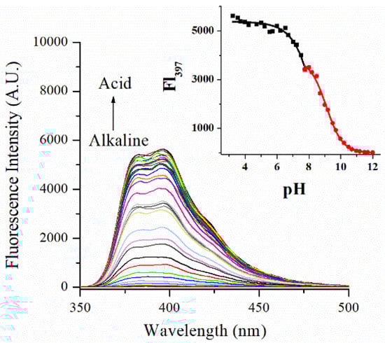 Figure 2. Fluorescent spectra of probe 4 in 100% aqueous solution in a pH-interval 2–12 (λex = 340 nm). Inset: pH titration plot of the probe 4 fluorescence intensity at 397 nm.