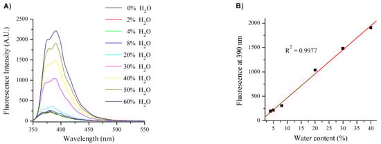 Similarly, the synthesized compound 4 is highly water-soluble and possesses a PET receptor containing both an amino group and an acid fragment (acid amide). This encouraged us to investigate the ability of probe 4 to detect water content in organic solvents. For this purpose, the fluorescent spectra of 4 were recorded in dry ethanol and mixtures of ethanol/water (Figure 3A). As can be seen from Figure 3, the fluorescent intensity of probe 4 increased gradually with the increase in water content in the solutions under study. This is due to both the changes in pH and the microenvironment around the fluorophore. Since the main effect is pH, which is well defined only in pure water, the solution pH value is strongly dependent on the water content in the organic solvent. From the fluorescent changes at 390 nm, a calibration plot was constructed, which showed a linear range from 4% to 40% of water content (Figure 3B). Based on the linear calibration plot, the limit of detection LOD = 3% was calculated using the equation LOD = 3 σ/b, where b is the slope and σ is the standard deviation of 10 measurements in the dry solvent [67].