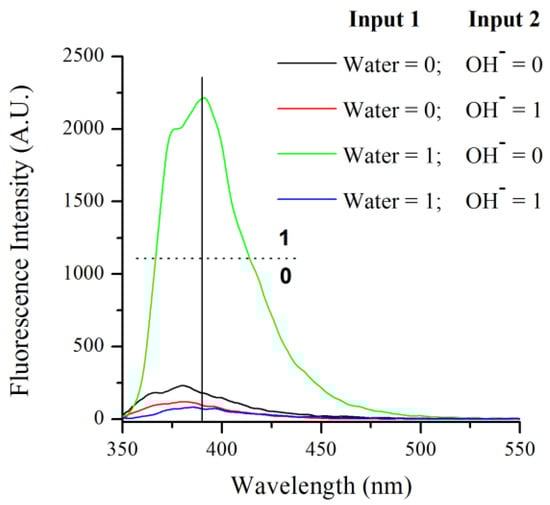 As chemical inputs in this logic gate, NaOH (10−6 mol/L) and water (50% content) in an ethanol solution containing 10−5 mol/L of probe 4 were used. The obtained signaling output of the achieved logic gate was depicted in Figure 4. As can be seen, higher emission of 4, coded in binary as 1, is observed only in the presence of water as an input, while the presence of NaOH blocks the effect of water and the system shows low fluorescence, coded in binary as 0, in all other input combinations. This behavior mimics very well the INH logic gate, where the water is the enabler and NaOH is the disabler [68,69,70].