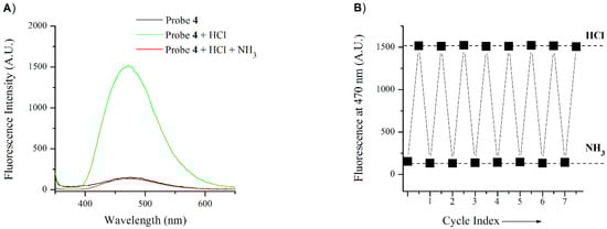 Before exposure, the fluorescence emission of the examined film showed low fluorescence due to the possible PET quenching process in probe 4. After the exposure to HCl vapors, the PET process was disallowed and the fluorescence was amplified, which was visible even by a naked eye (Figure 5). Furthermore, the high fluorescence output of 4 was “turned off” again after exposure to NH3 vapor for 2 s (Figure 6A) due to the deprotonation of the fluorescent quaternary ammonium salt of compound 4.