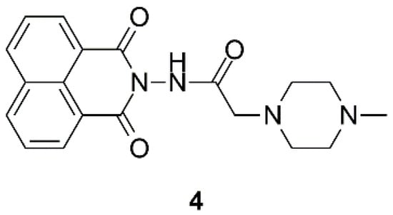 The novel probe 4 was designed on a classic “fluorophore-spacer-receptor” model, as the methylpiperazine unit containing two electron-rich amino groups is the receptor and the 1,8-naphthalimide unit is the fluorophore. The introduction of amines in the N-position of the 1,8-naphthaimides significantly increases their hydrophilicity [51,52,53]. That is why to obtain a water-soluble compound, the piperazine receptor in compound 4 was bound to the N-position of the fluorophore. We chose an unsubstituted 1,8-naphthaimide unit instead of the commonly used 4-amino or 4-oxy substituted one due to the push-pull ICT nature of the 1,8-naphthaimide derivatives. It is well known that in the 1,8-naphthaimide exited state occurs charge transfer from the C-4 electron-donating position to the carbonyl electron-accepting groups that generate an electron-rich field around the imide [54,55]. The strong repulsive character of the resulted field seriously restricts the PET process from N-position to the fluorophore in the electron-rich architecture such as 4-amino-1,8-naphthalimides [56,57,58]. This effect was reduced in the unsubstituted electron poorer derivatives that generated a weaker repulsive field around the imide cycle of the fluorophore [59].