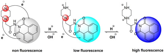 57. Georgiev, N.I.; Bojinov, V.B.; Nikolov, P.S. The design, synthesis and photophysical properties of two novel 1,8-naphthalimide fluorescent pH sensors based on PET and ICT. Dye. Pigment. 2011, 88, 350–357. [Google Scholar] [CrossRef]