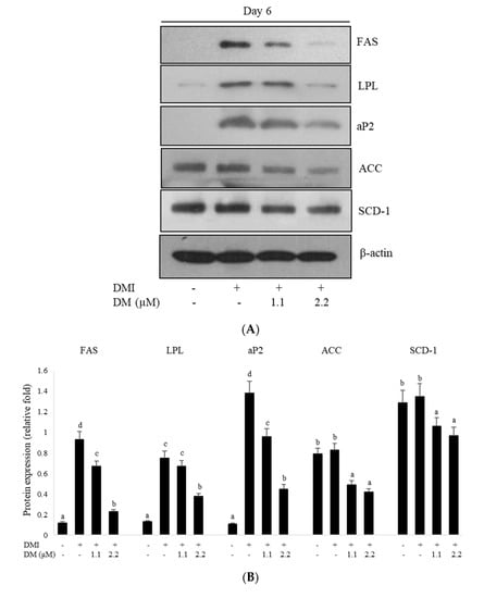 To examine whether the reduced expression of the C/EBP family, PPARγ, and SREBP-1c further regulated the expression levels of their target genes, such as aP2, FAS, and LPL, we assessed their expression during 3T3-L1 differentiation. Although treatment with DMI increased the expression levels of FAS, aP2, and LPL, DM treatment significantly decreased the expression of adipogenesis-specific genes involved in lipid metabolism, FAS, aP2, and LPL compared to those in DMI-treated differentiated adipocytes (Figure 3A). The effects of DM on the expression levels of the lipogenic genes including ACC and SCD-1 were measured by Western blotting. Treatment with DM significantly down-regulated the expression of the lipogenic genes, ACC and SCD-1, compared to the fully differentiated 3T3-L1 adipocytes (Figure 3A). Together, these results indicated that DM reduced the expression of PPARγ, SREBP-1c, and C/EBPs and their target genes involved in adipogenesis and lipogenesis.