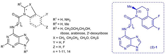 In recent years, our efforts have been focused on the search for efficient antiviral agents among purine and 2-aminopurine derivatives. For this purpose, we synthesized a number of conjugates of purine and 2-aminopurine with various N-heterocycles, including chiral ones, which are attached via a linker, the omega-aminocarboxylic acid NH(CH2)nCO residue, to position 6 of the purine nucleus (Figure 2) [22,23,24,25,26,27,28,29,30,31]. During our investigations, we varied the structure of the heterocycle (including the configuration of the chiral center in the case of chiral compounds), the length of the polymethylene chain of the linker, and the substituent at the N9 atom of purine. Most of the resulting compounds were tested against herpes simplex virus type 1 (HSV-1), including the acyclovir-resistant strain. Compounds containing a linker fragment with n ≥ 5 are of the greatest interest in terms of anti-herpesvirus activity. The most active compound turned out to be a purine conjugate with (S)-7,8-difluoro-3,4-dihydro-3-methyl-2H-[1,4]benzoxazine attached via a 6-aminohexanoyl residue (n = 5, compound (S)-1) [27,28,29]. We have demonstrated that it is the combination of difluorobenzoxazine and purine fragments in one molecule that leads to high anti-herpesvirus activity, including that against the acyclovir-resistant HSV-1 strain [27].