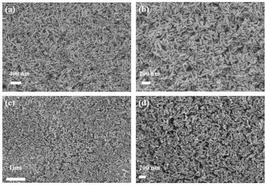 SEM images of ZSTU-2 (a,b) and NH2-ZSTU-2 (c,d).