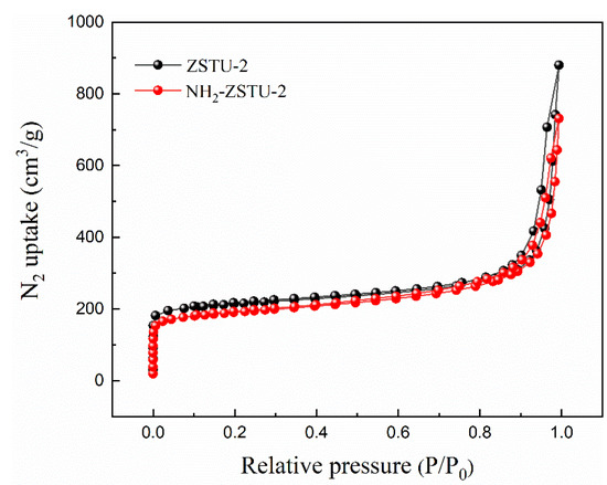 Nitrogen sorption isotherms of ZSTU-2 and NH2-ZSTU-2.