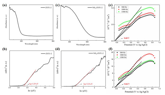 Band structural information of photocatalysts. The solid-state diffuse reflectance absorption spectra of ZSTU-2 (a) and NH2-ZSTU-2 (c); Tauc plots for ZSTU-2 (b) and NH2-ZSTU-2 (d), presenting band gap of MOFs calculated under the hypothesis that absorption follows: (αhν)2 = K (hν − Eg); Mott–Schottky plots of ZSTU-2 (e) and NH2-ZSTU-2 (f).