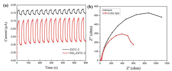 The generation of separated electron-hole pairs was characterized by both transient photocurrent responses and electrochemical impedance spectroscopy (EIS) measurements. As shown in Figure 6a, ZSTU-2 showed low transient photocurrent response under visible light due to the narrow light-harvesting region. As expected, the transient photocurrent responses of NH2-ZSTU-2 increased dramatically, which indicated that a better photogenerated charge carries separation efficiency. The EIS of NH2-ZSTU-2 was further studied both with and without visible light irradiation. As shown in Figure 6b, compared with the dark state, dramatically decreased radius of the EIS curve under visible light irradiation indicated that a large number of separated electron-hole pairs were photogenerated in NH2-ZSTU-2 with visible light shining on.