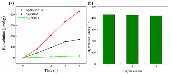 Photocatalytic performance. (a) Time-dependent photocatalytic hydrogen production of Pt@ZSTU-2, Pt@NH2-ZSTU-2, and NH2-ZSTU-2 in triethanolamine/acetonitrile/water system under visible light irradiation; (b) recycle performance of Pt@NH2-ZSTU-2 under same condition.