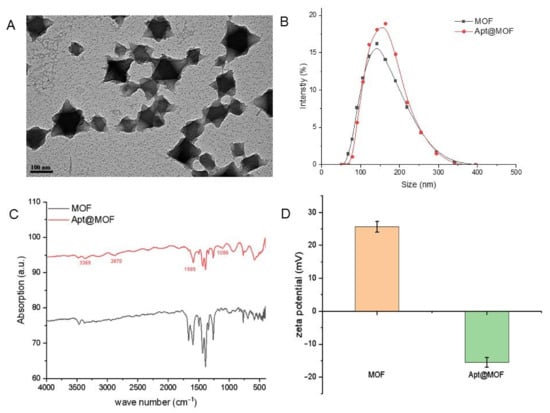 Characterization of the TA-MOF. (A) TEM observation of the MOF. (B) Analysis of the overall particle size distribution of nanoparticles by DLS. (C) FTIR analysis of the amide bond formation. (D) Comparison of the surface potential of the nanoparticles before and after modification.
