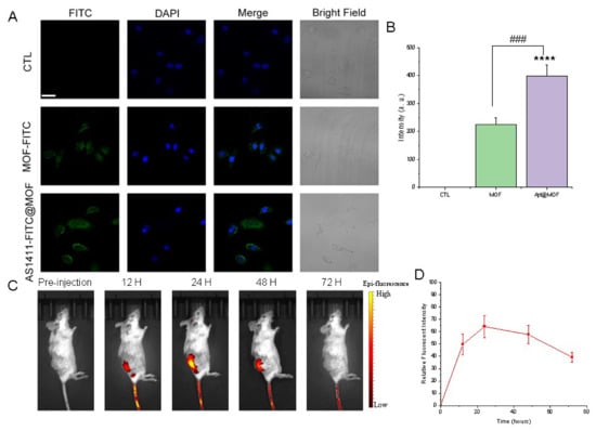 Cellular internalization: In order to observe the cellular internalization of MOF, we referred to the previous paper, but in a slightly different way [33]. In brief, cells were washed by PBS 2–3 times for 2–3 min each time. After changing the medium and adding nanoparticles at the same time, the cells were co-incubated at 37 °C for a specified time. The free nanoparticles were then removed, and the cells were immobilized with 4% paraformaldehyde for 10 min before staining the cytoskeleton and nucleus. After dyeing, the free dyes were washed away, and the fluorescence distribution was observed by laser scanning confocal microscope (LSCM).
