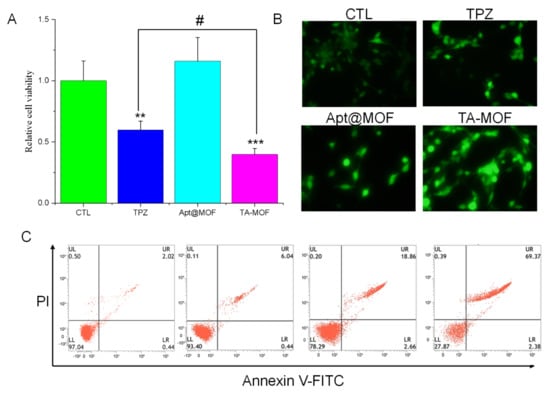 The antitumor effect of TA-MOF in vitro. (A) CCK8 detected the changes in cell viability after the TA-MOF treatment. The data are presented as the mean ± SEM (n = 3; ** p < 0.01 versus the control group, *** p < 0.001 versus the control group, # p < 0.05 versus the indicated group). (B) Apoptosis was detected by flow cytometry after the TA-MOF treatment. (C) ROS production was observed by fluorescence imaging and DCFH-DA staining.