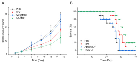 The antitumor effect of TA-MOF in vivo. (A) The tumor volume growth curve verified the antitumor effect of the different treatment groups. (B) The survival rate curves of mice in different treatment groups.