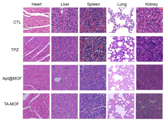 To verify the safety of the material, we performed an autopsy on mice 3 days after administration and obtained the major organs for H&E staining. The experimental results showed (Figure 5) that there was no obvious damage to the major organs. The experimental results showed that the nanoparticles had no obvious tissue toxicity, which was consistent with the previous study of MOF as a carrier.