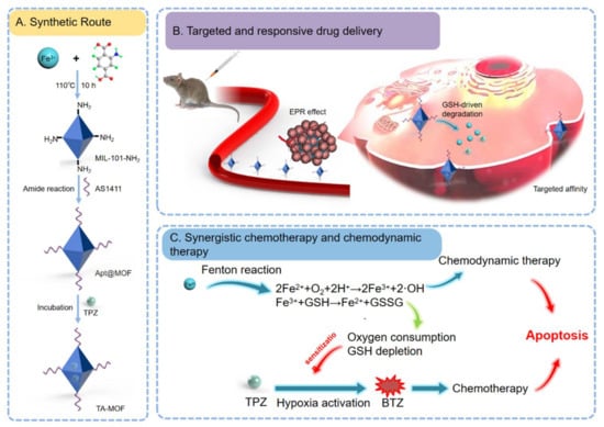 Chemodynamic therapy (CDT) is an emerging tumor therapy strategy that converts hydrogen peroxide (H2O2) into the most toxic reactive oxygen species (ROS) -hydroxyl radical (•OH) at the tumor site through a Fenton/Fenton-like reaction, thus inducing apoptosis and necrosis of tumor cells [20,21,22,23]. Compared with traditional therapies, CDT has a higher tumor specificity and selectivity and lower systemic toxicity. Iron-based materials are efficient and inexpensive Fenton reagents and are widely used in CDT because iron is a microelement in the body. Among them, iron-based metal–organic frameworks (MOFs) have the following advantages: (1) a large pore surface with high drug adsorption capacity; (2) susceptibility to chemical modification, and the pores and surfaces can have specific host–guest interaction; and (3) good biodegradability and biocompatibility [24,25,26,27,28,29]. These advantages indicate that iron-based MOFs have a broad application prospect in the field of tumor comprehensive therapy. Fan et al. reported that MOFs can release loads in response to GSH and simultaneously produce divalent iron ions [30]. Divalent iron ions can catalyze the transformation of the excess H2O2 produced by cancer cells into highly toxic hydroxyl radicals. Meanwhile, the divalent iron can react with the oxygen in cells to further consume the oxygen in tumors and aggravate the hypoxia state. Therefore, iron-based MOFs are ideal drug delivery carriers for HAPs, which can improve the tumor enrichment of drugs through targeted modification, while releasing iron ions mediates the Fenton reaction and oxygen consumption to enhance the antitumor effect of TPZ.